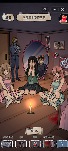 3、第三个故事依次点击电视、绳子、面具、床下的血迹、门把手、雕像的刀、镜子中的男主,随后左滑回头就能过关了。