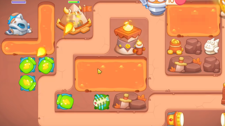 2、岩石打掉之后建立瓶子炮,锁定左边钱袋,有金币就给瓶子炮升级。