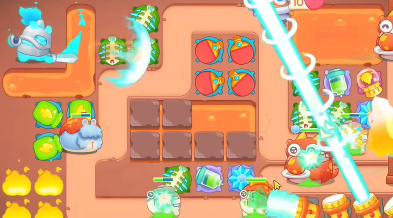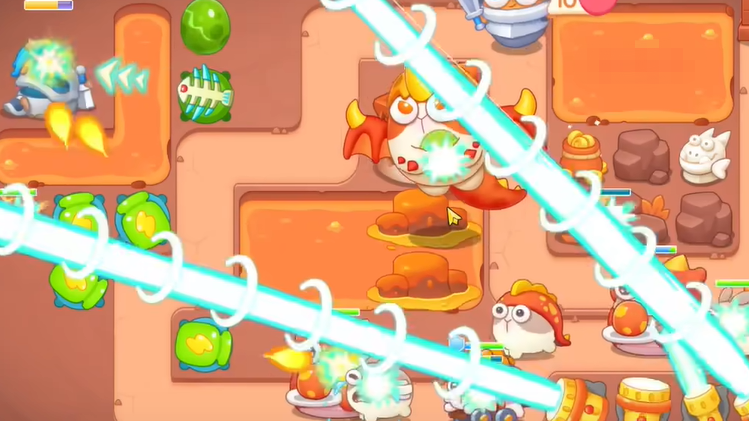 10、这一关主要是打BOSS,BOSS会不断下蛋炸掉我们塔防,不过好在有幽灵剑士帮助,具体炮塔如下。