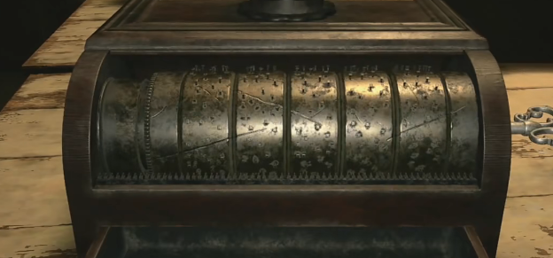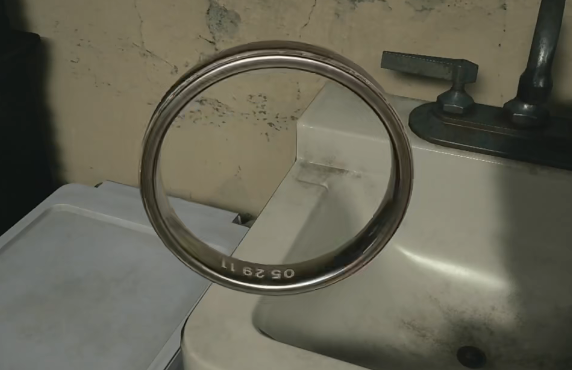 9、将桌子上假人手上的戒指取下,还有左腿的发条,右肩的钥匙,用钥匙打开木偶室用水清洗戒指,得到密码052911。