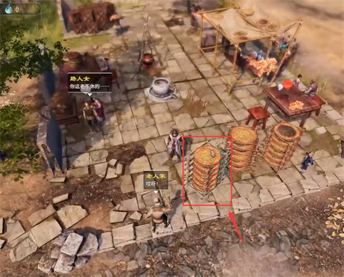 2、在下图药材铺的架子上点火烧蜈蚣,下图的红框中就是架子。