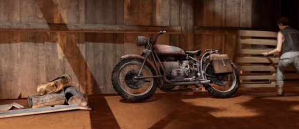 2、前往仓库,然后利用附近的零件将摩托车修好。