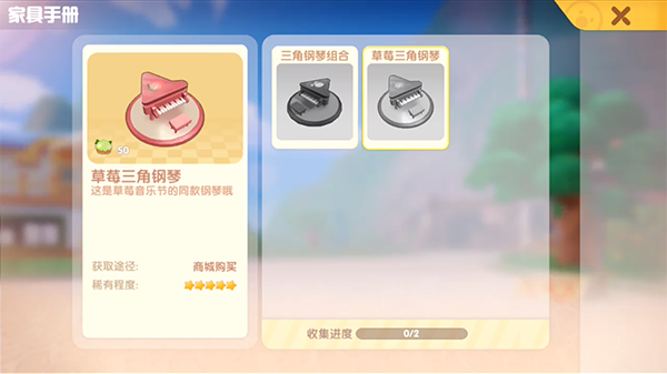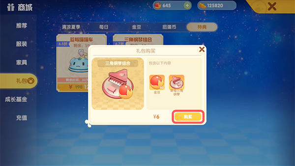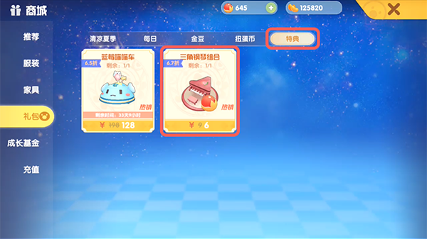 4、最后在特典中,找到三角钢琴组合,即可花费6元购买钢琴礼包,内含草莓钢琴和60金豆。