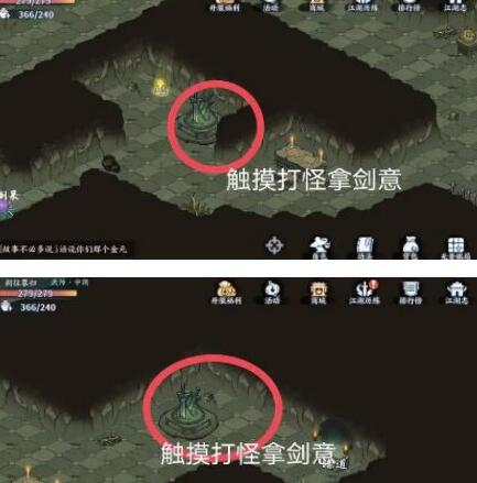2、之后继续往里面探索,在下图的两个位置也是触摸剑台,打怪拿剑意即可;